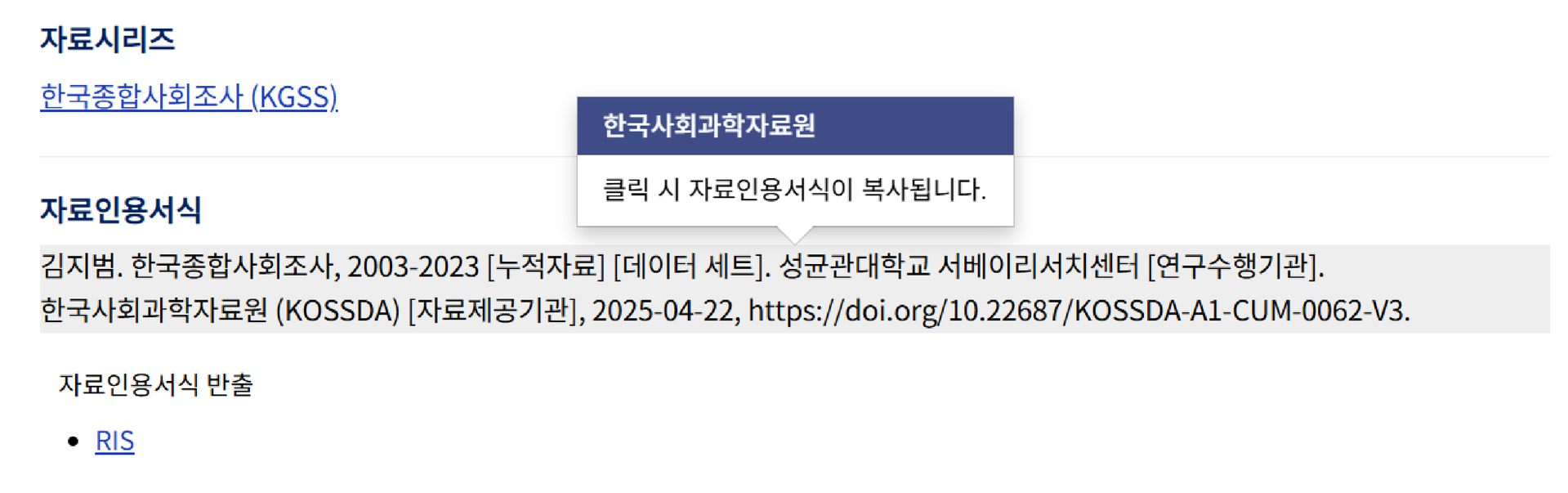 ☞ 데이터 인용에 대해 더 알고 싶으시다면 “KOSSDA 데이터 인용 가이드북”을 확인해주세요!